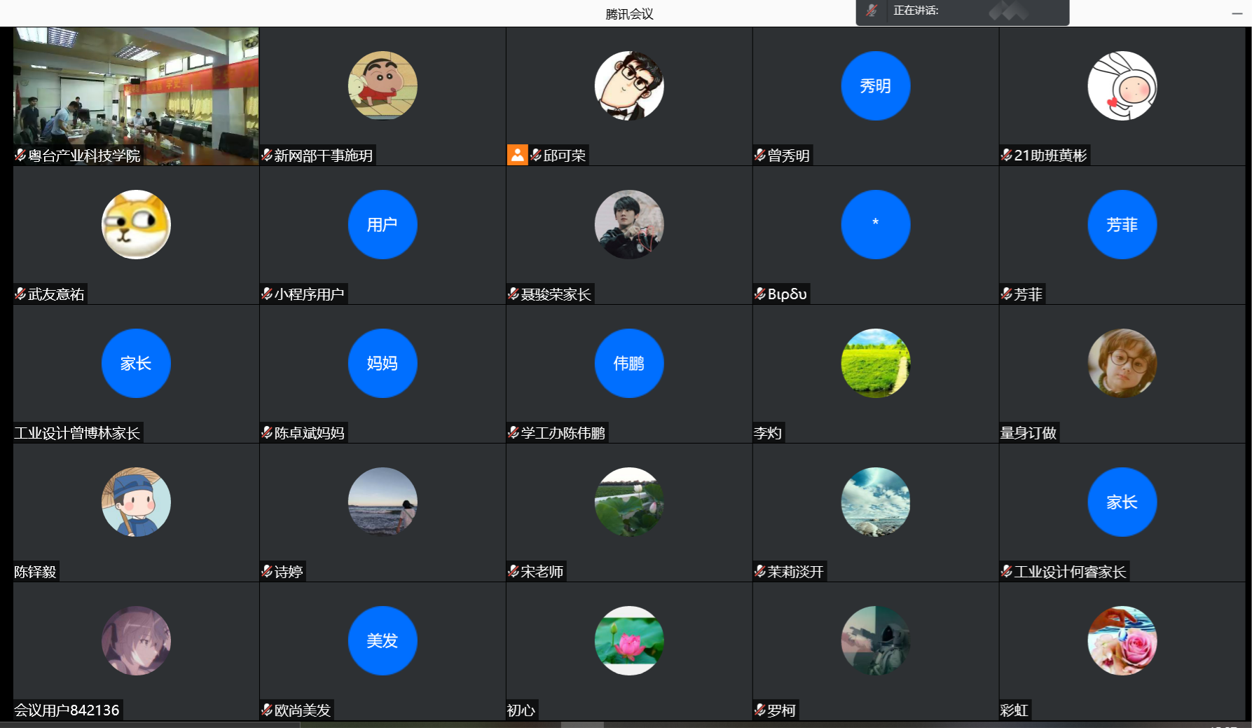 2021级新生线上家长会于实验楼302举行。本次参会人员有:学院书记宋美娴,院长陈伟,教务处主任黄灯奎,办公室主任张世邦,院团委书记陈伟鹏,辅导员邱可荣以及各位新生家长。会议由学院书记宋美娴主持。