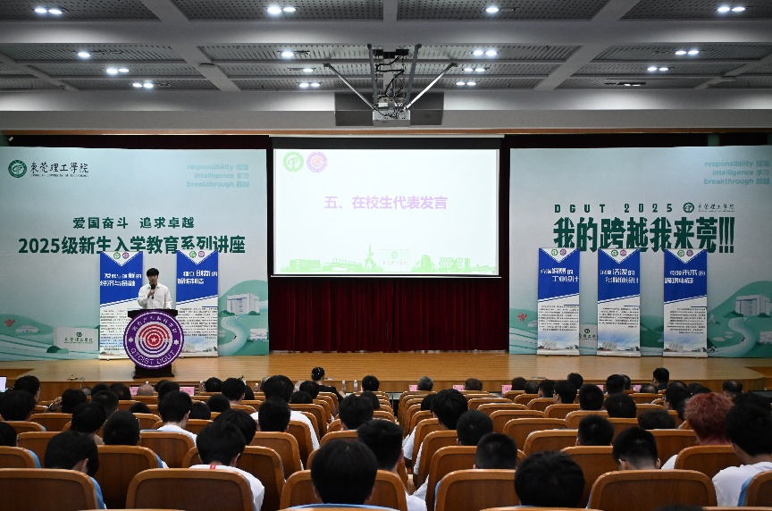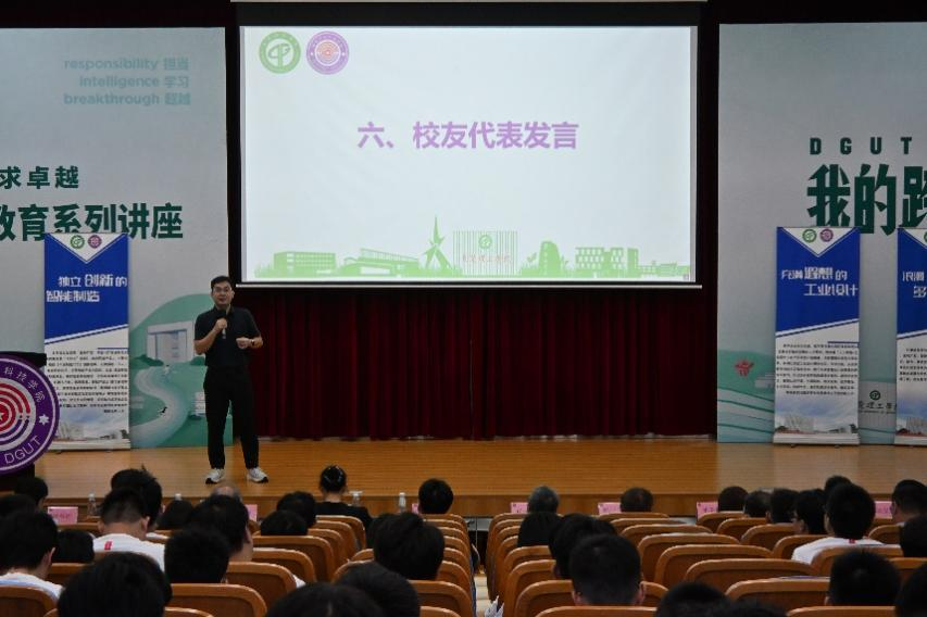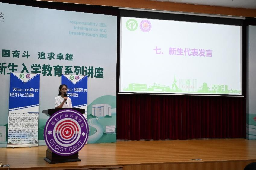 在校生代表沈佳明分享成长经验,他鼓励师弟们要充分利用好看球吧 这个不一样的平台,实现不一样的精彩。校友代表,校友会会长陈金晖为新生送上祝福,祝愿新同学在大学生活中锚定目标,实现理想。新生代表武俊尧表达了对未来的期待。她表示,来到莞工,来到粤台,将通过自己的努力,积极向老师和同学学习,使自己不断提升。