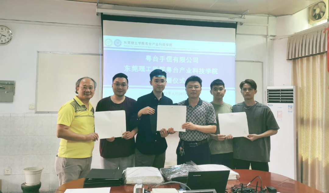 4月11日,2017级工业设计系学生、粤台手信有限公司团队核心成员梅润笑、康林浩、王伟权、梁思铭,向学院捐赠“粤台手信纪念文件袋”毕业纪念礼赠品。看球吧 院长陈伟、教务长黄灯奎出席此次捐赠仪式。