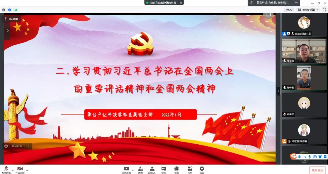 随后,陈伟鹏传达了习近平总书记在全国两会上的重要讲话精神。他指出,习近平总书记回顾新时代党和人民奋进历程,首次鲜明提出“五个必由之路”的重大论断,阐述我国发展仍具有的战略性的“五个有利条件”,深刻揭示了新时代我们为什么成功、未来我们怎样继续成功的中国密码,具有重大的历史意义和现实指导意义。他要求学生党员要深刻理解“五个必由之路”和“五个有利条件”的内涵理念,不断地激发自身内在动力,踔厉奋发,砥砺新征程。