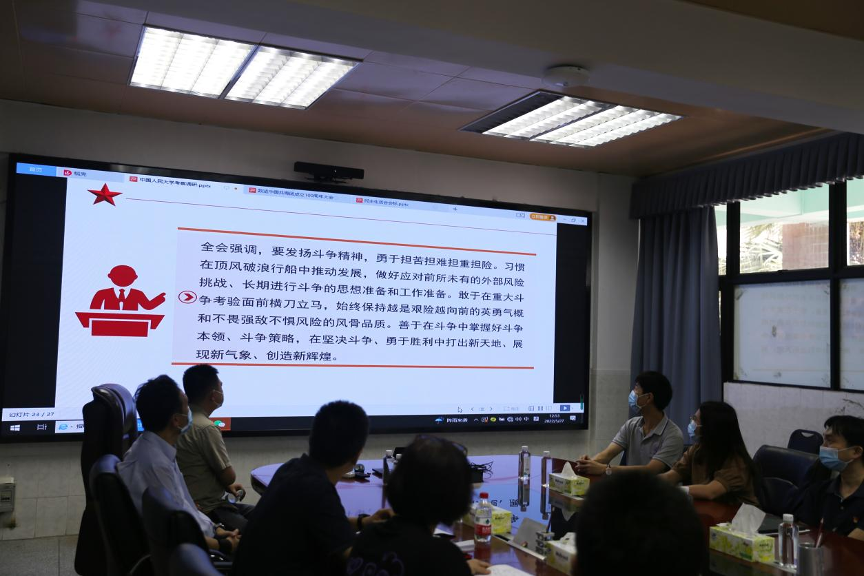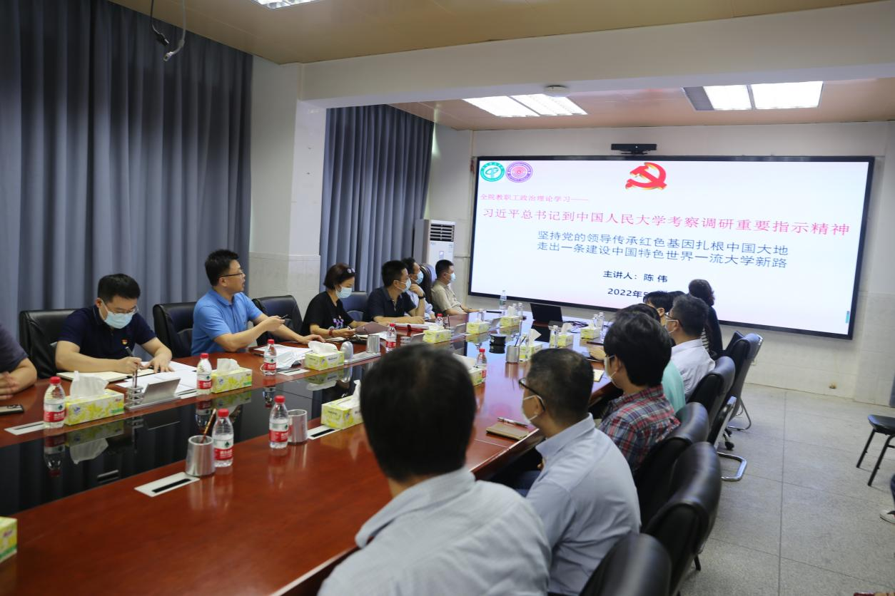在302会议室召开教职工政治理论学习会,深入学习贯彻习近平总书记到中国人民大学考察调研重要讲话精神。院长陈伟、书记宋美娴、副书记谢春晓及全院教职工参加。会议由宋美娴主持,陈伟作辅导报告。