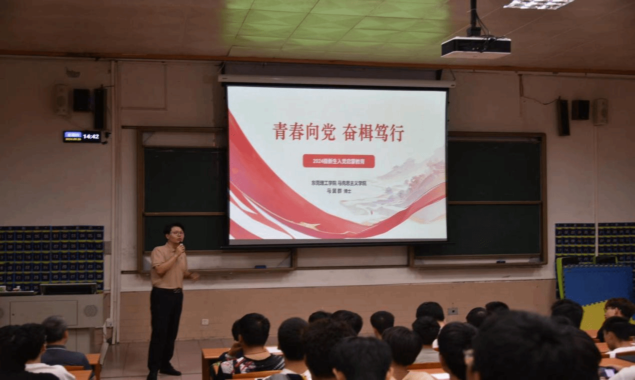 邀请马克思主义学院马冀群博士为2024级全体新生讲授了以《青春向党 奋楫笃行》为题的入党启蒙教育党课,会议由学院党委副书记丘永辉主持。