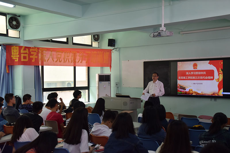 分党校第八期入党积极分子培训班第二讲在实验楼314举行,授课主题为 “深入学习贯彻中共东莞理工学院第三次党代会精神”,主讲人王玉副书记。