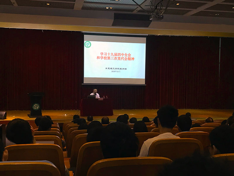师生参加了在莞城校区学术报告厅举行的学习十九届四中全会和学校第三次党代会精神宣讲会,宣讲人为校纪委副书记邢大立。
