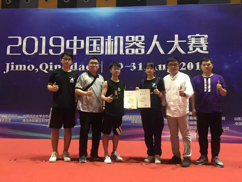 跨专业的5名同学组成。本次参赛机器人全部由学院学生自主设计研发,从2018年9月至2019年8月,各组学生在老师的指导下准备比赛,包括确定比赛项目、机器人控制板设计与开发、视觉系统及传感器开发、机器人结构设计、机器人零部件3D建模及3D打印制作、动作调试等。进入暑假以后,参赛同学与队长赖丁裕一起以实验室为家,日夜奋战。指导老师在比赛前对参赛项目进行了验收并提出改进意见,力争完美。