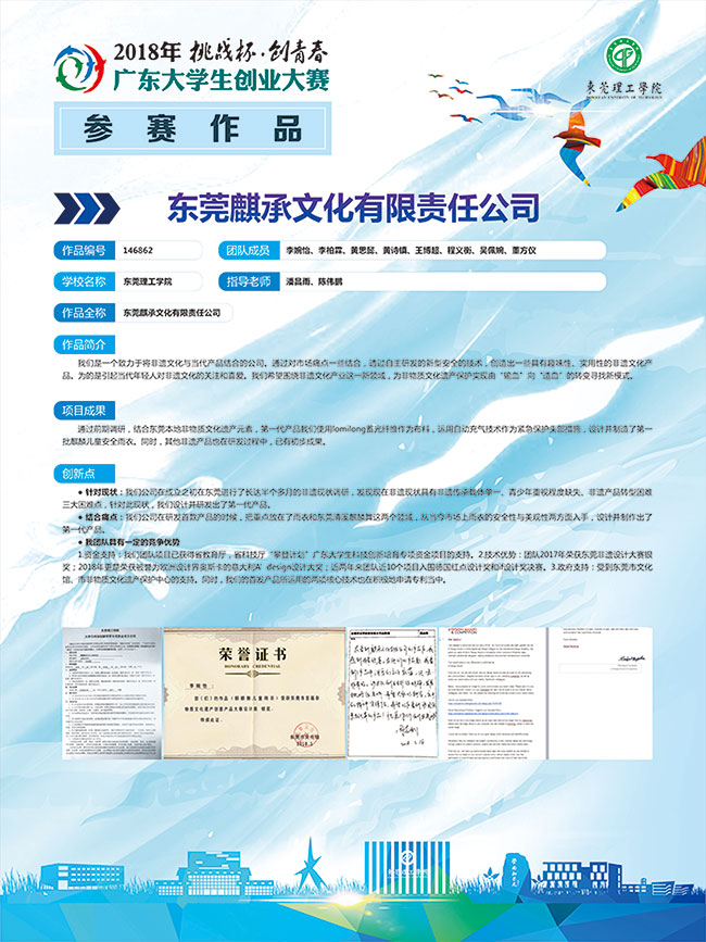 的作品“东莞麒承文化有限责任公司”参加2018年“挑战杯•创青春”广东大学生创业大赛终审决赛,最终喜获省赛银奖。