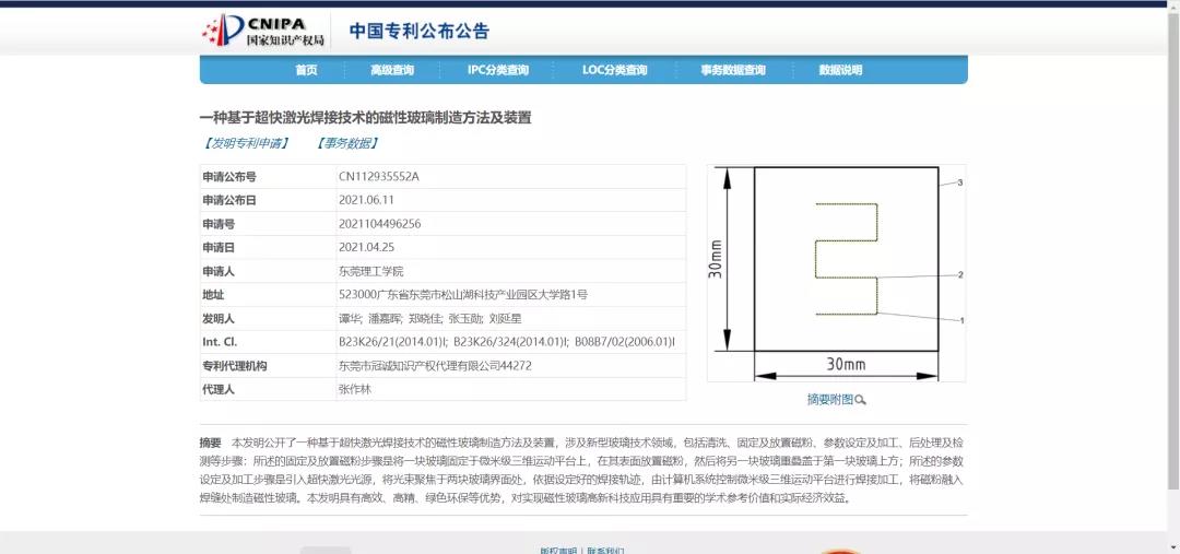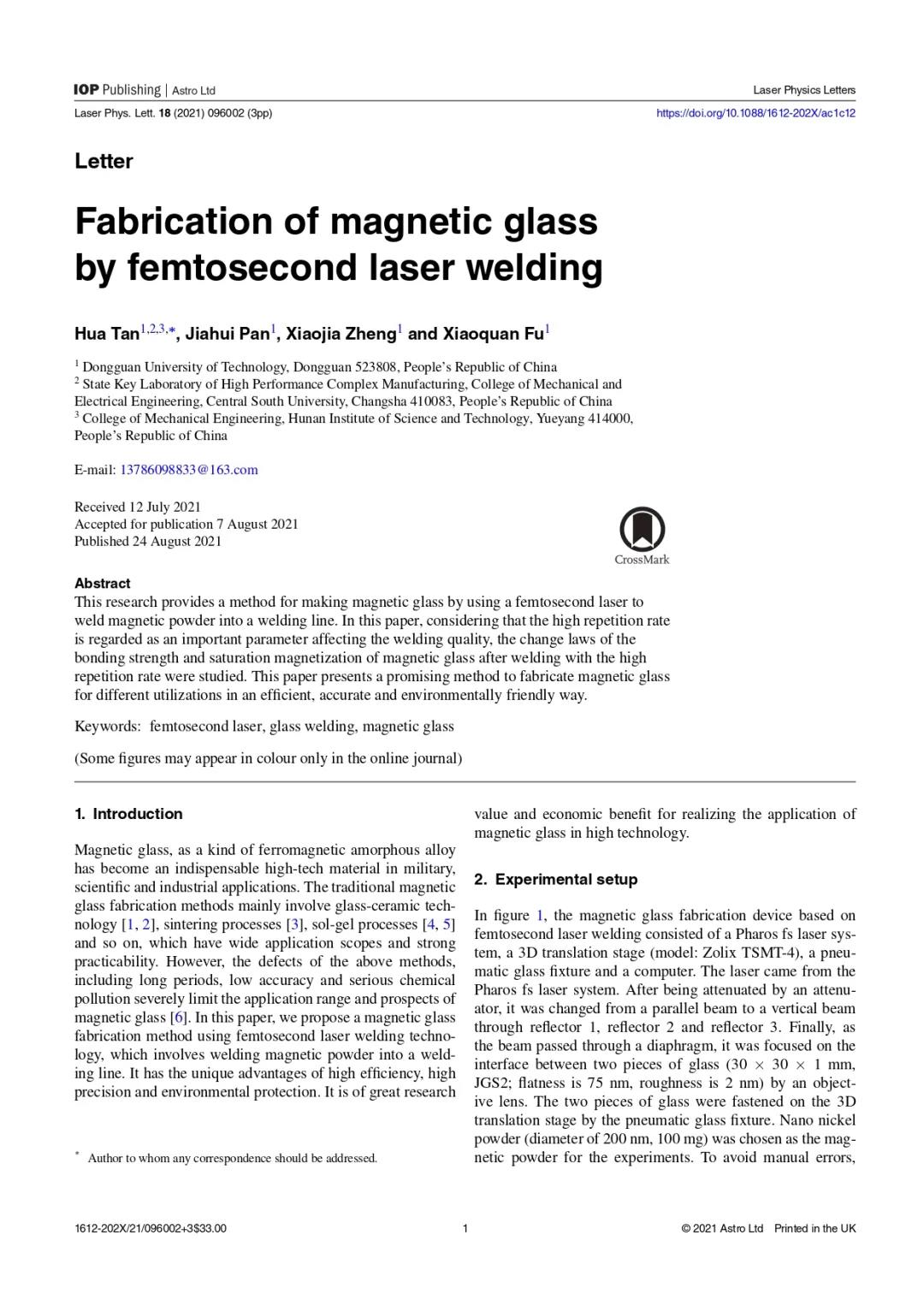 2020级智能制造工程2班两位学生潘嘉晖、郑晓佳,在学院副教授谭华的指导下,于国际激光加工领域学术期刊《Laser Physics Letters》发表SCI学术论文1篇:《Fabrication of magnetic glass by femtosecond laser welding》(中科院SCI三区);申请国家发明专利2项,其中1项已提前公布。