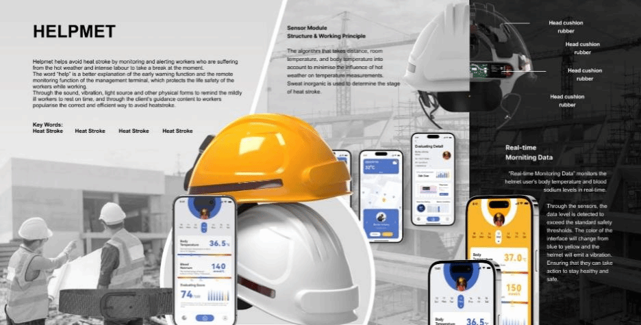 刘辉同学得奖作品Helpmet是一款旨在高温环境下保护建筑工人健康的智能头盔,它集成了传感器监测模块物理信息通知模块能够实时智能监测用户的身体状况,实时地将数据传输到app,联动工人、工友和工头共同关注热相关状况的疾病风险,提供及时的预警和建议,以确保工人的安全和健康。