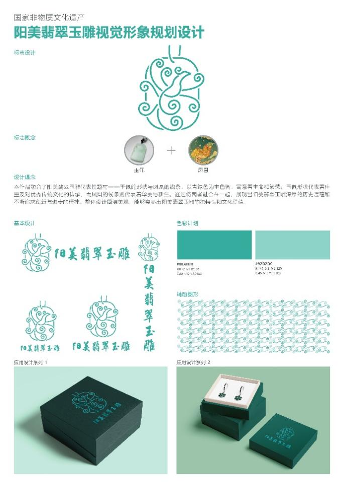 本次获奖作品融合了国家级非物质文化遗产阳美翡翠玉雕代表性题材——玉佩的形状与凤凰的线条,以青绿色为主色调,寓意着生命和繁荣。玉佩形状代表着庄重及对优秀传统文化的传承,而凤凰的线条则代表着华美与新生。通过将两者融合在一起,展现出阳美翡翠玉雕深厚的历史底蕴和不断追求创新与进步的精神。整体设计简洁美观,能够突显出阳美翡翠玉雕的独特性和文化价值。
